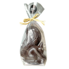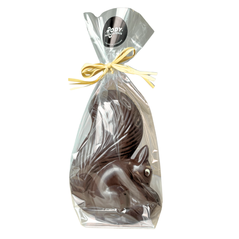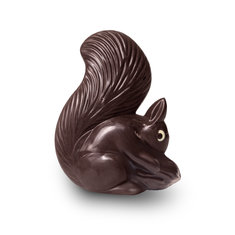 Écureuil en chocolat noir avec éclats de noisettes grillées.
