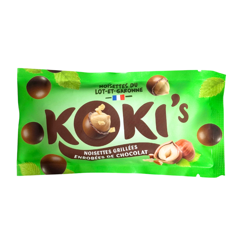 Les KOKI’S – Noisettes grillées (origine : Lot-et-Garonne) enrobées de chocolat au lait